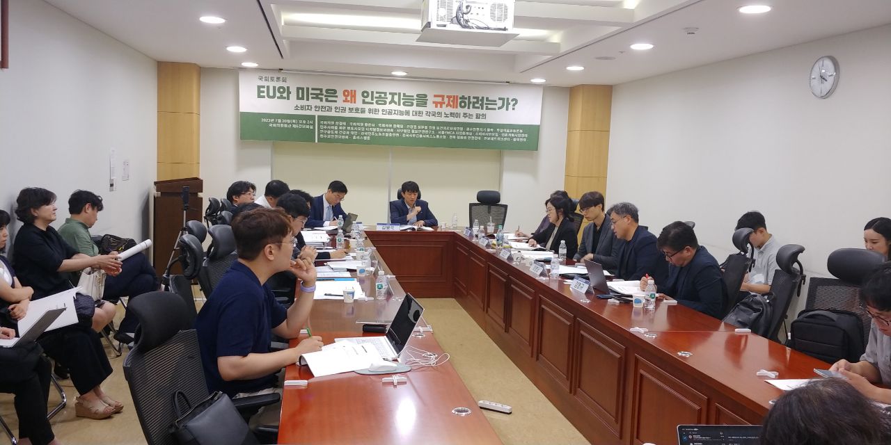 - 지난 7/20(목) 16개 인권·시민사회단체와 더불어민주당 장경태 국회의원, 황운하 국회의원, 정의당 장혜영 국회의원은 국회 토론회 <EU와 미국은 왜 인공지능을 규제하려는가? 소비자 안전과 인권 보호를 위한 인공지능에 대한 각국의 노력이 주는 함의>를 공동개최하였습니다. 그동안 시민사회는 특정 부처가 아닌 인권, 소비자보호, 개인정보보호 등을 소관하는 기관들이 함께 인공지능의 위험성과 기본권 침해를 예방할 수 있는 공적 체계를 마련해야 한다고 주장해 왔습니다. 이와 같은 취지에서 토론회에는 산업 진흥 부서인 과기부 뿐 아니라 인권위, 공정거래위와 개인정보보호위 및 국회입법조사처 담당자 등이 두루 참여해 인공지능의 공공성 확보에 대해 논의했습니다.
