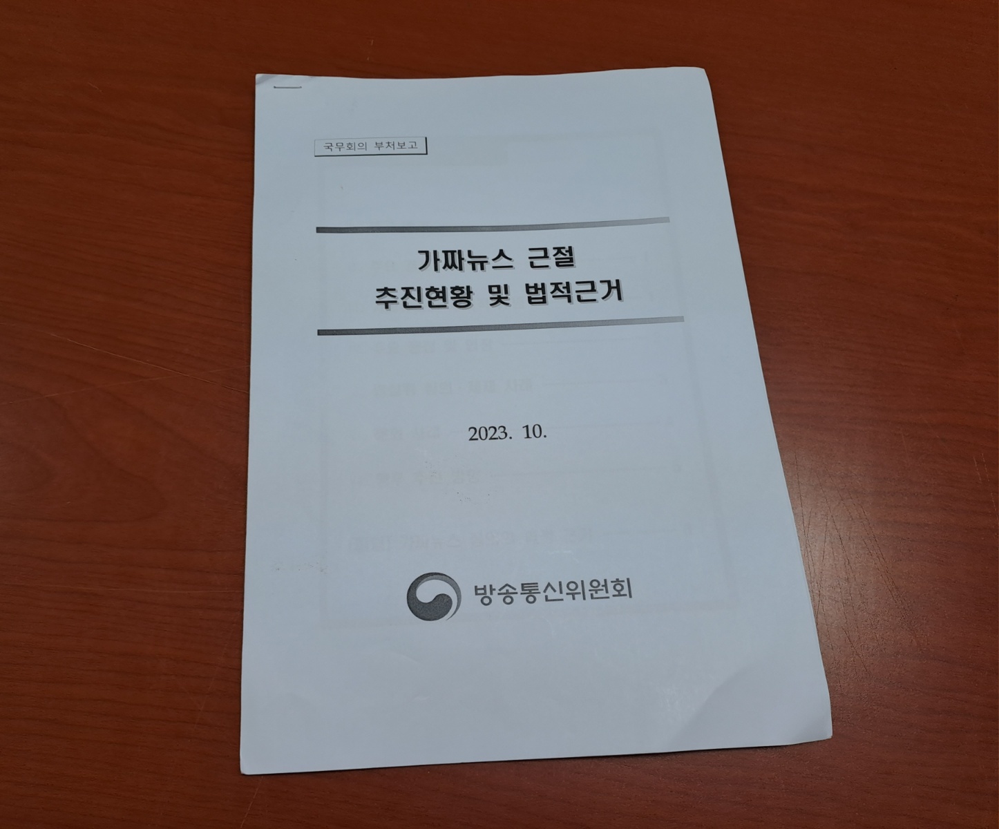 2. 지난달 방송통신위원회는 <가짜뉴스 근절 추진 현황과 해외 사례>라는 자료를 만들어 국무회의에 보고했습니다. 이동관 방송통신위원장은 10월 26일 국회 과방위 국정감사에서 ‘가짜뉴스’ 심의가 불법이며, 권한 남용이라는 야당 의원들의 비판에 “법적 근거는 충분히 있다”며 해당 보고서를 제시했습니다. 이어 류희림 방송통신심의위원장 역시 10월 30일 전체회의에 앞서 이 자료를 취재기자 등에게 배포했습니다.