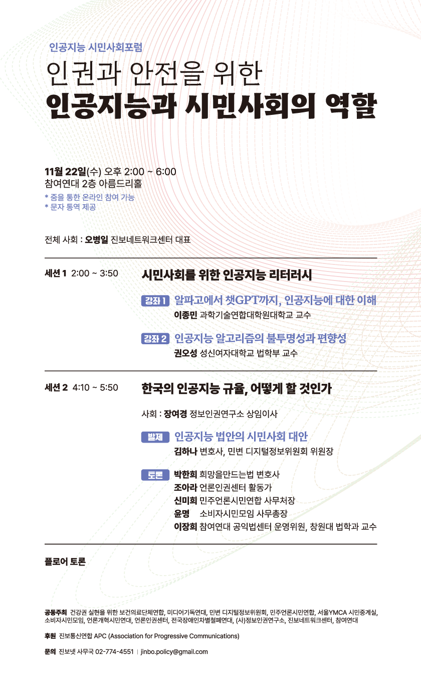 인공지능 시민사회포럼은 국내 시민사회 활동가들의 인공지능 기술에 대한 이해를 높이고 국내 인공지능 규율 방안에 대한 토론을 위해 기획되었습니다.