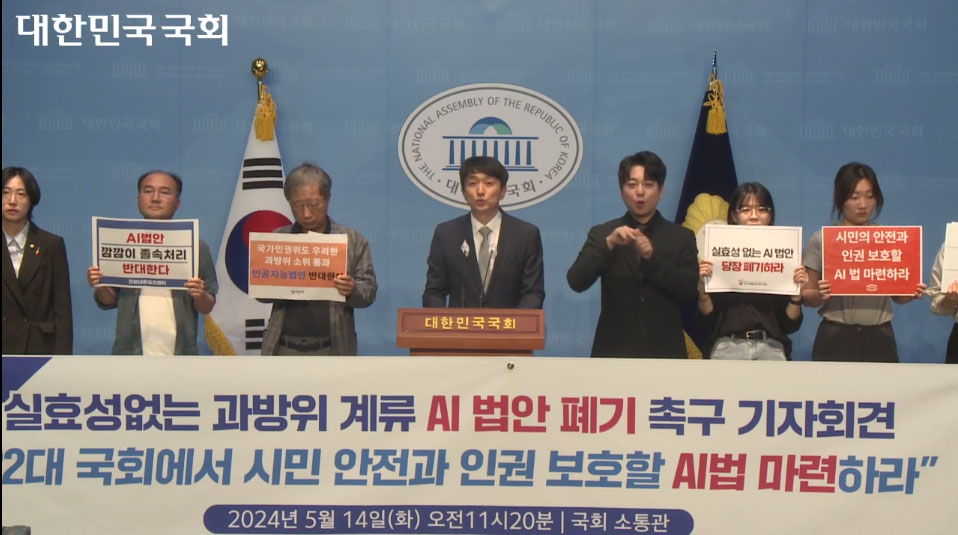 겨우 20여 일 남은 21대 국회에 AI법안 처리를 요구하는 정부와 업계의 압박이 거세다. AI법안에 대하여 비판하고 대안을 제시하는 활동을 해온 우리 단체들은 21대 국회에 현행 AI 법안을 폐기하고 안전과 인권을 보호하는 국제 기준을 반영해 22대 국회가 처리하도록 할 것을 요구한다.