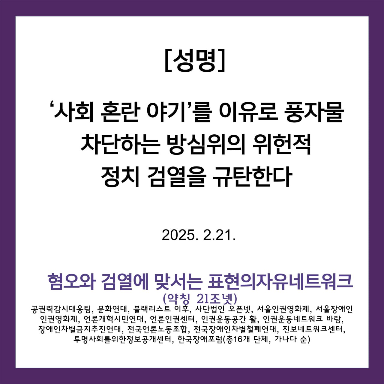 지난 2월 18일, 방송통신심의위원회(이하, 방심위)가 또다시 긴급 심의를 열어 윤석열 대통령 풍자 동영상을 ‘사회 혼란 야기’를 이유로 차단 결정했다. 허구임을 전제로 하여 대상을 조롱하고 비판하는 풍자물이 어떠한 사회적 혼란을 야기한다고 볼 수는 없음에도, 방심위가 본 심의규정을 적용하여 풍자물을 차단한 것은 시민의 정치적 표현의 자유를 침해하는 반민주적, 위헌적 검열이다.