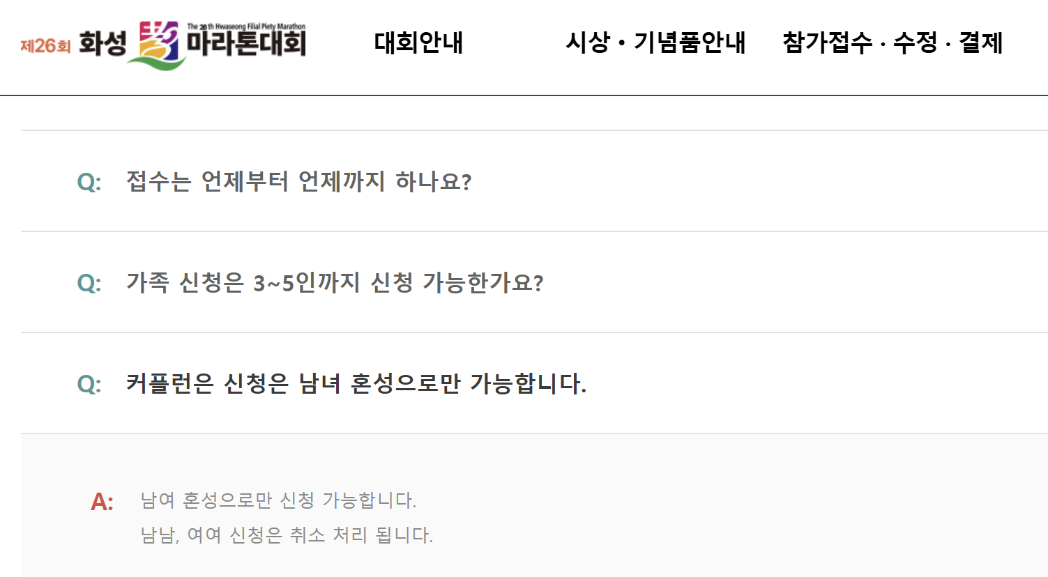 경기지역 시민단체는 경인일보가 공동으로 주최하는 화성 효 마라톤의 참가 대상 기준에 대해 문제를 제기해왔다. 참가 대상 기준의 차별적 요소 때문이다. 화성 효 마라톤은 참가 신청 대상을 커플런은 남·녀로, 가족런은 3-5인으로 규정하고 있다. 비혼, 동거, 한부모가족, 동성커플 등 다양한 가족 형태와 커플 관계는 화성 효 마라톤 참가 대상에서 제외되고 있는 셈이다. 시대에 따라 가족의 형태와 구성, 관계 맺는 방식이 다양해지고 있다. 사실혼, 비혼, 동성혼, 동거 등 다양한 방식으로 공동체를 이루어 사는 비친족 가구도 지속적으로 늘어나는 추세다. 사회적 흐름에 맞게 변화가 필요하다는 목소리는 당연한 요구다. 시민단체들이 차별적 기준에 대해 질의서를 보내고 문제 제기했지만, 마라톤 주최 측은 묵묵부답으로 일관하고 있다.