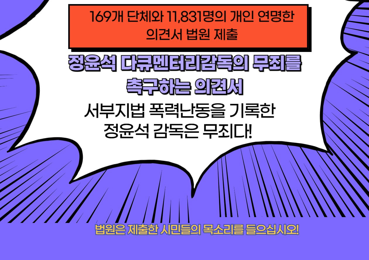 <논픽션 다이어리>, <밤섬해적단 서울불바다> <진리에게>등을 통해 한국 사회의 모순을 날카롭게 포착해 온 정윤석 감독이, '서부지법 사태' 관련 특수건조물침입 혐의에 대해 국민참여재판을 받을 권리를 재차 요구하며 항고했다.