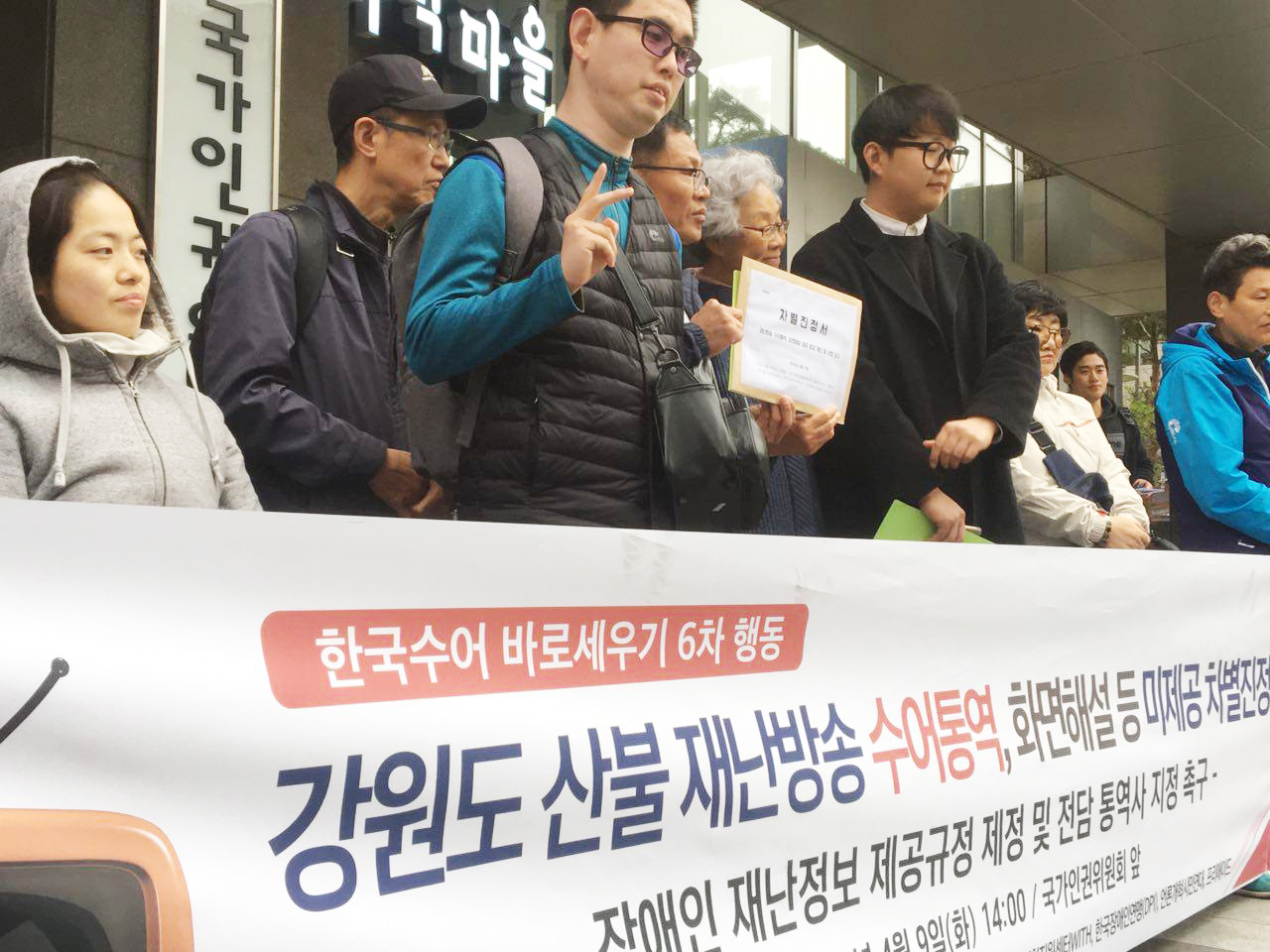 방송사들은 재난방송에 대한 충분한 준비가 되지 못했던 상황이었습니다. 그렇기에 수어방송 등 장애인방송이 즉각적으로 제공될 수 없었습니다. 우리 단체들은 그것이 문제라고 생각하고 있습니다. 9일 국가인권위원회 앞에서 재난방송 수어통역, 화면해설 등 미제공한 지상파 방송사(재난방송 주관방송사인 KBSMBC·SBS)와 중앙재난안전대책본부, 방송통신위원회를 상대로 차별진정을 낸 이유입니다.
