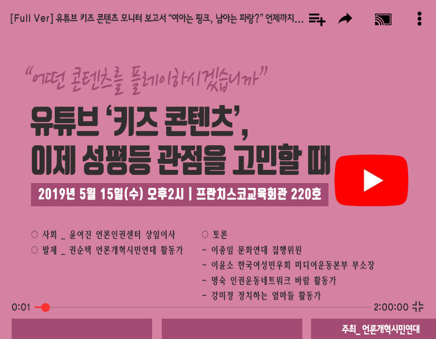 이 같은 유튜브 키즈 콘텐츠의 ‘젠더’ 의식에 대해 고민하는 층위는 다양하다. 콘텐츠를 직접 제작하는 크리에이터(키즈 포함)들의 1차적 고민이 있을 것이다. 또, 유튜브를 소비하는 이용자(아동·청소년 보호자 포함) 그리고 여성 및 미디어비평 시민사회 역시 마찬가지다. 그런 점에서 언론연대는 유튜브 키즈 콘텐츠에 대한 성차별에 대한 모니터를 진행했다. 유튜브 콘텐츠들이 성고정적인 모습을 보여주고 있지는 않은지, 인권-젠더적 폭력성을 드러나고 있지 않는지 살펴봤고 그 결과를 내놓으려고 한다.