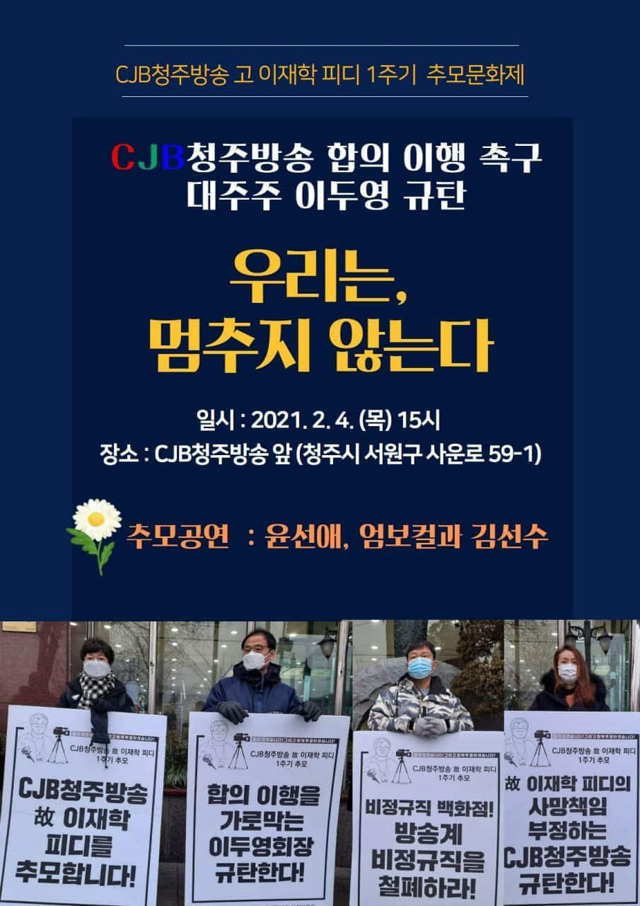 CJB청주방송 고 이재학 PD가 사망한 지 1주기 되는 날이다. 그러나 유가족들은 여전히 고통 속에 있다. 그리고 CJB청주방송 앞에는 다시 1인 시위가 진행되고 있다. 참담하지 않을 수 없다.
