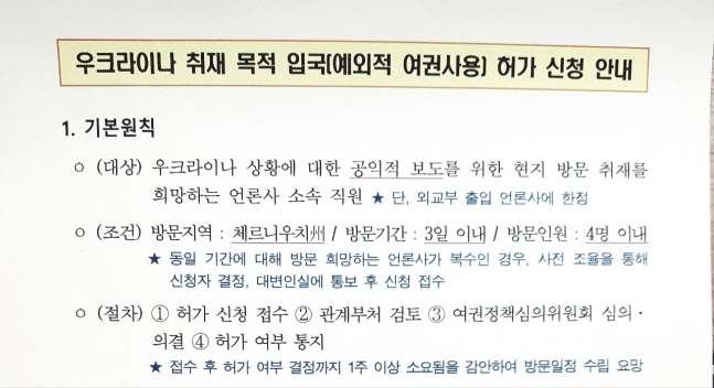 국내 언론의 우크라이나 현지 취재는 지난달 18일부터 허용됐다. 외교부의 우크라이나 전 지역에 관한 흑색경보가 풀리면서다. 다만 여전히 자유로운 취재활동은 불가능하다. 정부는 국내 취재진들로 하여금 ▲우크라이나 서남부 체르니우치 지역 내(한국 임시대사관 거주 지역)로 취재를 제안했다. 취재활동 또한 ▲외교부 출입 언론사 기준, ▲동일기간 4명 이내, ▲2박3일 체류 허용하고 있는 것으로 알려졌다. 언론인들의 불만이 쏟아지는 이유다.