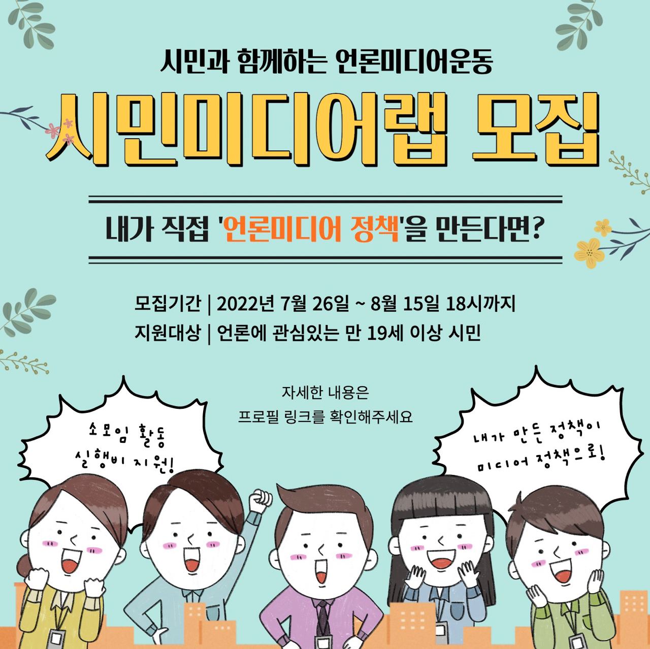 | [2차공모]시민과 함께하는 언론·미디어운동 시민미디어랩 모집 (0) | 2022.08.17 |