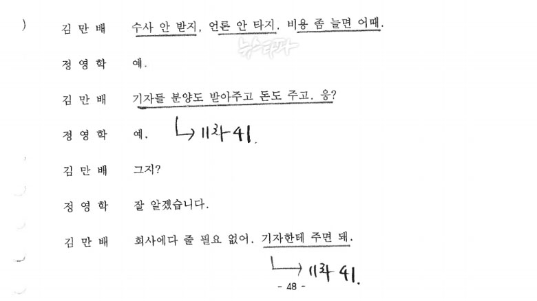 김만배 씨는 본인이 관리하는 언론인들의 모임을 ‘지회’라고 불렀다고 한다. 그리고 떡밥을 던져주듯, 아파트를 분양 받아주거나, 명품을 건네거나, 골프를 접대하거나, 상품권을 살포하거나 다양한 방법으로 기자들을 관리했다. 김 씨는 이렇듯 ‘언론’이 가지는 힘을 정확히 알고 있었고, 그를 이용하고자 했다. 실제 ‘정영학 녹취록’을 보면, ‘(김만배가) 기자분들 먹여 살린다’, ‘비용 좀 늘면 어때. 수사 안 받지, 언론 안타지’ 등의 낯 뜨거운 문구가 눈에 띈다.