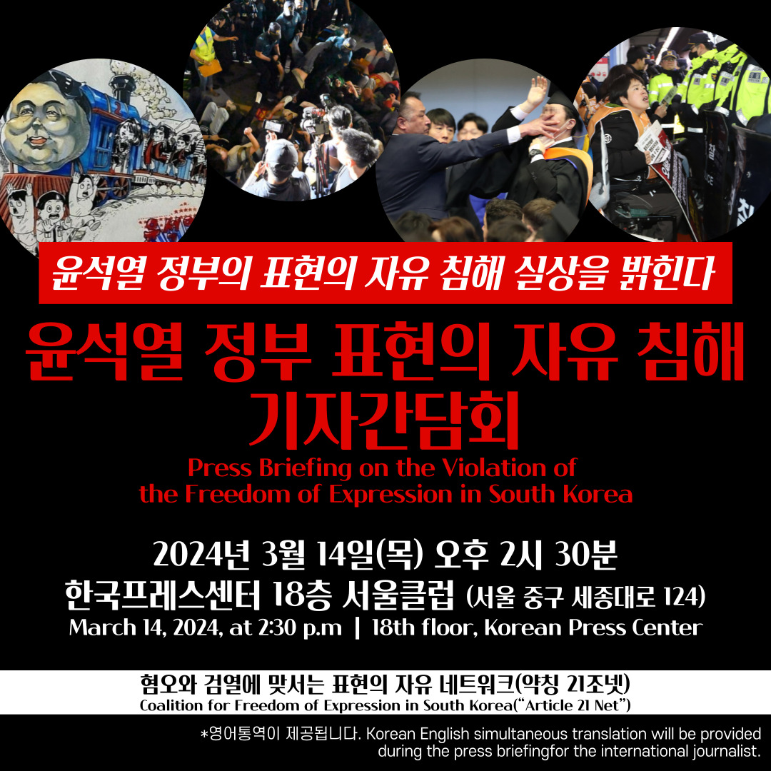 | 윤석열 정부의 표현의 자유 침해 실상을 밝힌다 윤석열 정부 표현의 자유 침해 기자간담회 2024년 3월 14일(목) 오후 2시30분, 한국프레스센터 18층 서울클럽(구 외신기자클럽) 사회 : 오병일 진보네트워크센터 대표 언론의 자유 탄압_ 전국언론노동조합 문화예술 검열_ 블랙리스트이후, 장애인권영화제 집회·시위의 자유_ 한국장애포럼, 인권운동네트워크 바람 알권리 및 온라인표현의 자유_ 정보공개센터, 오픈넷 주최 : 혐오와 검열에 맞서는 표현의 자유 네트워크 (약칭 21조넷) |