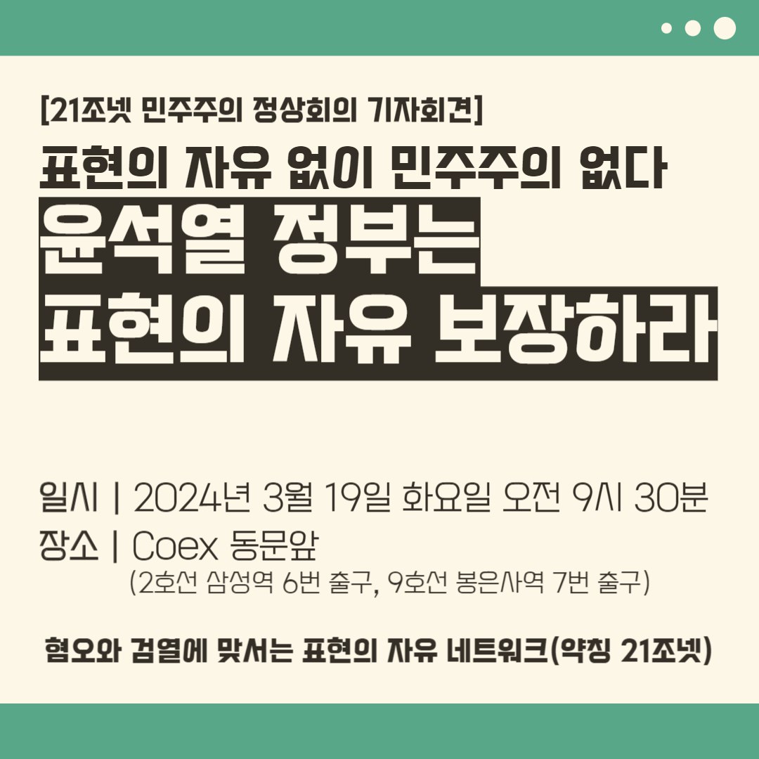 3. 3월 14일(목) 언론, 집회•시위, 문화예술 표현, 인터넷상 표현 및 공공정보 접근•알권리 5개 부문에서 활동하는 전국 16개 단체(혐오와 검열에 맞서는 표현의 자유 네트워크: 약칭 21조넷)가 각 부문별 표현의 자유 침해 사례를 알린 바 있습니다.