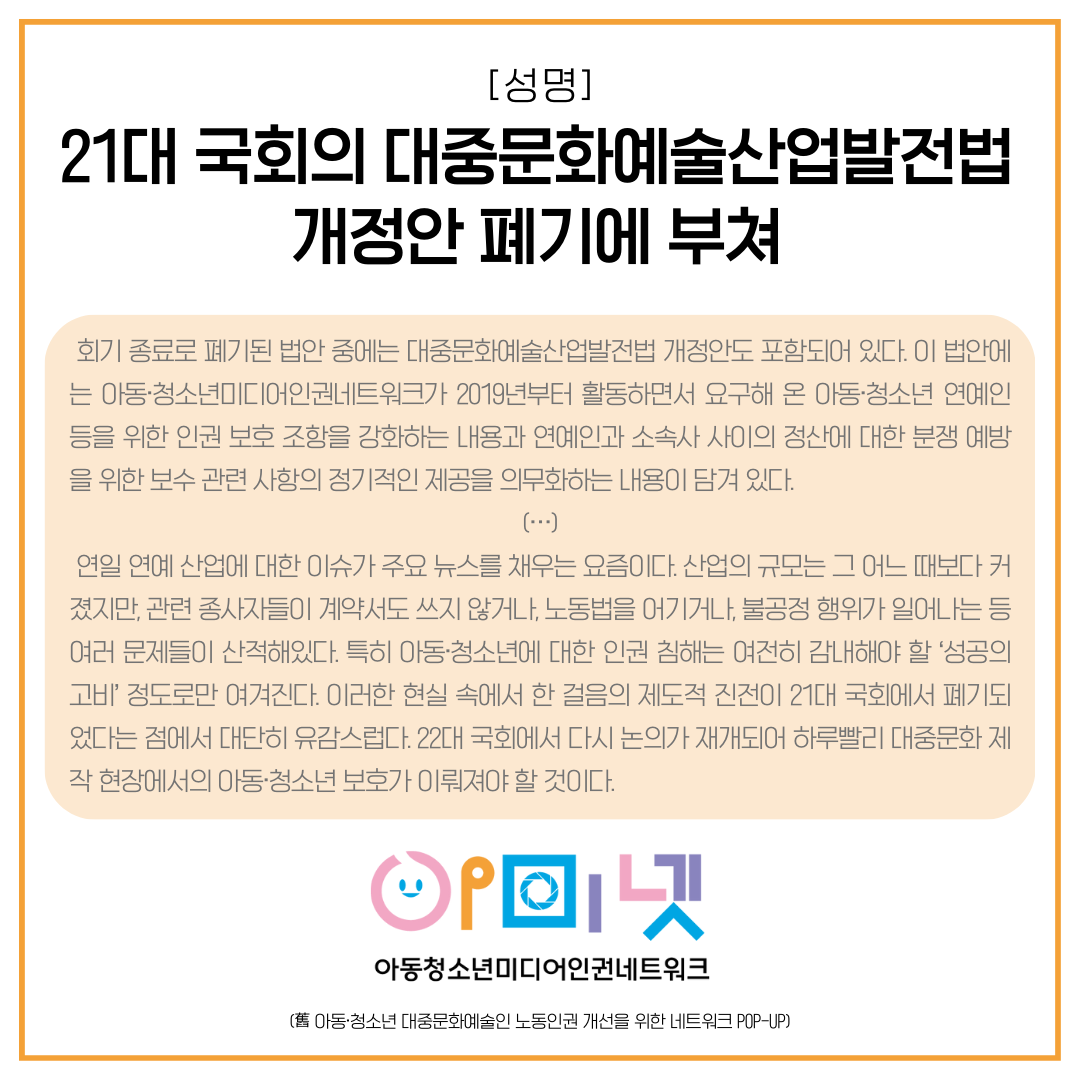 회기 종료로 폐기된 법안 중에는 대중문화예술산업발전법 개정안도 포함되어 있다. 이 법안에는 아동·청소년미디어인권네트워크가 2019년부터 활동하면서 요구해 온 아동·청소년 연예인 등을 위한 인권 보호 조항을 강화하는 내용과 연예인과 소속사 사이의 정산에 대한 분쟁 예방을 위한 보수 관련 사항의 정기적인 제공을 의무화하는 내용이 담겨 있다.