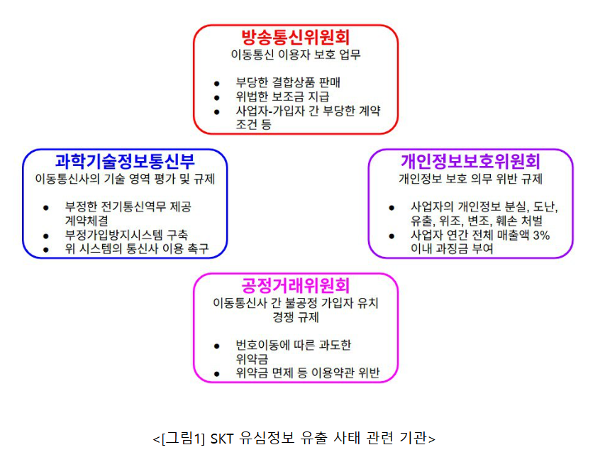 위 그림을 보면 이동통신사에 대한 규제와 처벌 기관이 분산된 것을 알 수 있습니다. 과기부는 이동통신사의 기술적 영역에 대한 평가와 규제를, 방송통신위원회는 이동통신사 간 부당 거래나 이용자와의 위법한 계약 점검을, 개인정보보호위원회는 개인정보 보호 의무 이행하지 않은 사업자에 대한 처벌을, 그리고 공정거래위원회는 말 그대로 SKT를 믿을 수 없어 통신사를 바꾸려는 가입자에 대한 보호 조치를 해야 합니다.