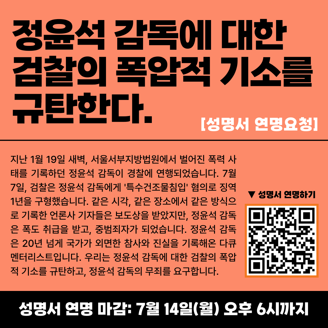 [-7.14] 성명서: 예술가를 범죄자로, 기록을 범죄로 - 정윤석 감독에 대한 검찰의 폭압적 기소를 규탄한다