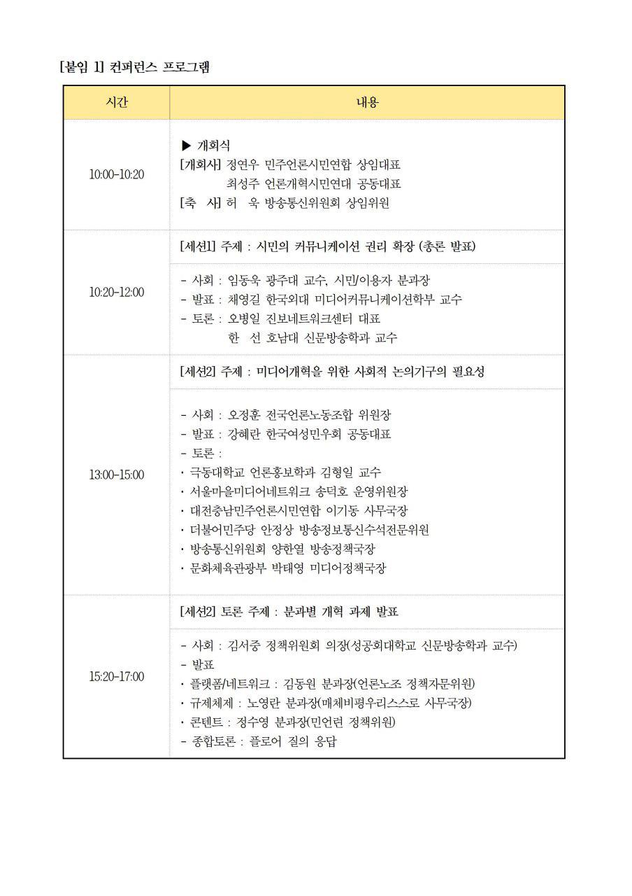 2. 미디어개혁시민네트워크는 오는 11월 12일, 그간의 논의 결과를 중간 발표하는 <미디어정책 컨퍼런스>를 개최합니다. 이번 컨퍼런스에서는 미디어개혁의 핵심 가치로 ‘시민의 커뮤니케이션 권리 확장’을 제시하고, 이에 기초한 미디어 정책 개선의 방향을 분야별로 제안하려고 합니다. 빠르게 변화하는 미디어환경에 맞춰 정책과 규제의 틀을 혁신해야 한다는 목소리가 높지만 정작 미디어 이용의 주체인 시민의 권리에 주목하는 논의는 찾아보기 어렵습니다. 정부와 국회는 미디어개혁을 위한 사회적 논의에 큰 관심을 기울이지 않고 있습니다. 이번 컨퍼런스가 미디어개혁을 위한 사회적 논의를 필요성을 확인하고, 새로운 미디어환경에서 시민의 권리를 확장하는 토론의 장이 되길 기대합니다. 기자 여러분의 많은 관심과 참석을 부탁드립니다. 고맙습니다. (끝)