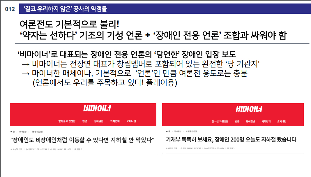서울교통공사의 그릇된 언론관 또한 문제다. 공사는 경향신문과 한겨레, 오마이뉴스를 지목해서는 “약자는 선하다는 기조의 기성 언론”으로 치부했다. 또한 비마이너는 “장애인 전용 언론”, “당 기관지” 등으로 매도해버렸다. 그야말로 장애인을 비롯한 사회적 소수자들의 인권 향상을 위해 노력해온 언론사와 기사에 대한 모독이다.